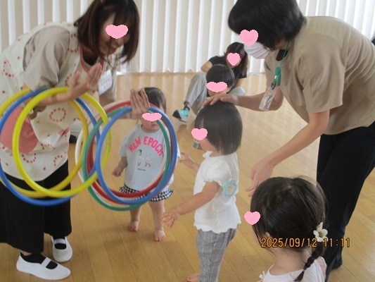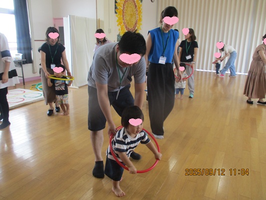 幼稚園にご入園される前のお子様と保護者の方とが一緒に楽しめる『ふわふわクラブ』では、愛着を育てるほのぼのとした活動を月毎に用意しています。9月のふわふわクラブは、カワイ体育教室の講師を招き、ロボットや時計に変身した遊びや、トンネル潜り、フープや鉄棒でも体を動かして楽しんでもらいました。次回は、