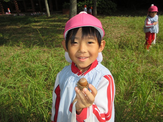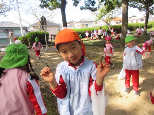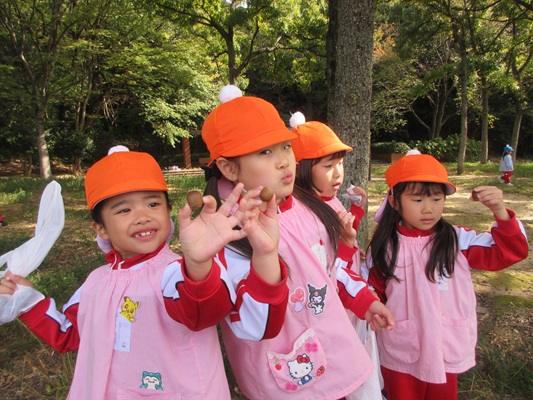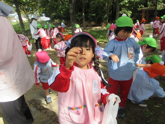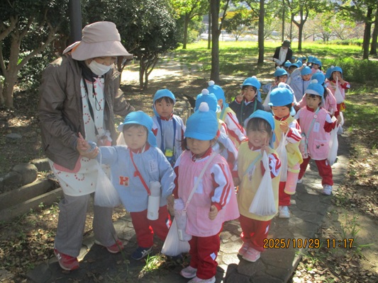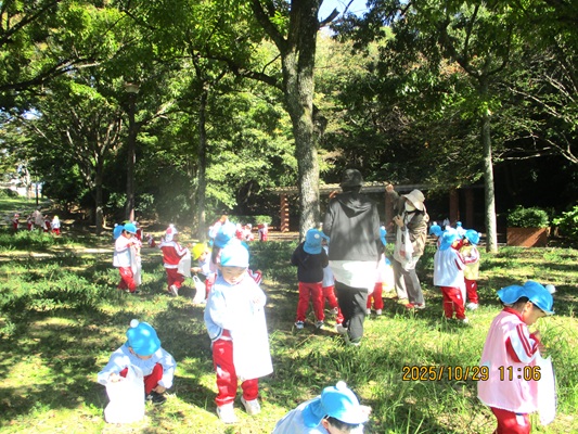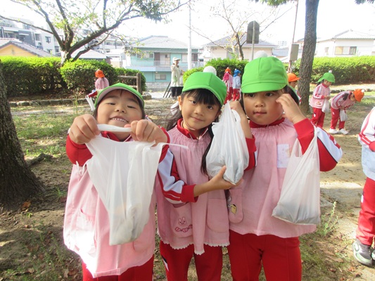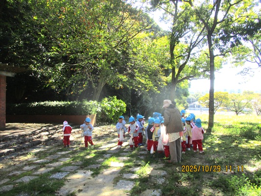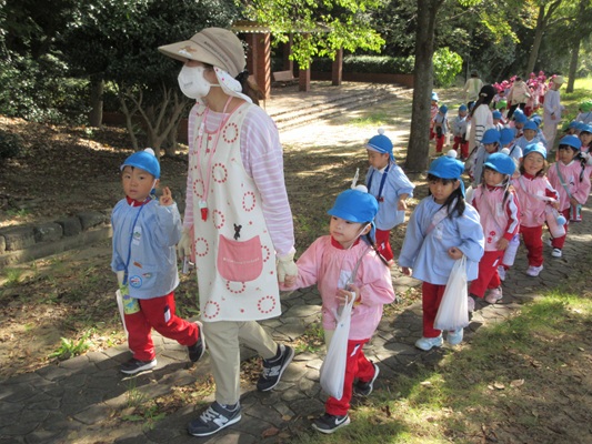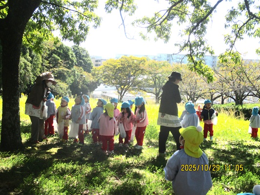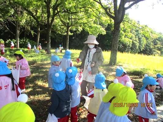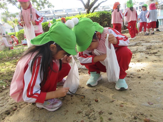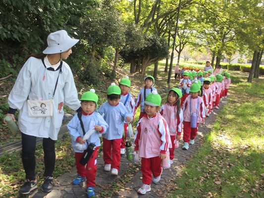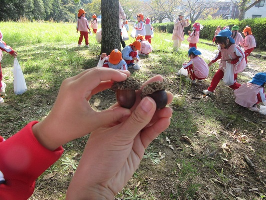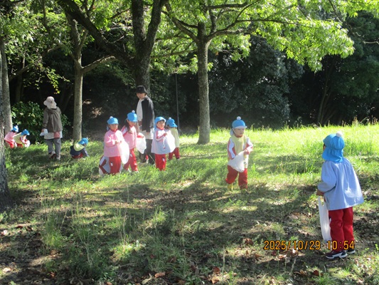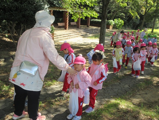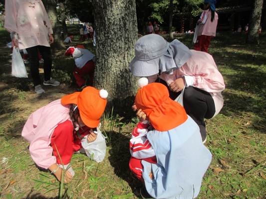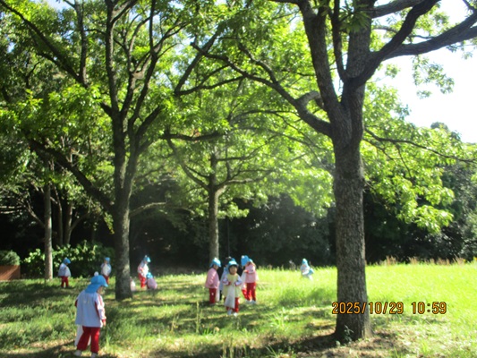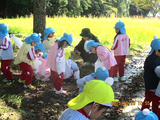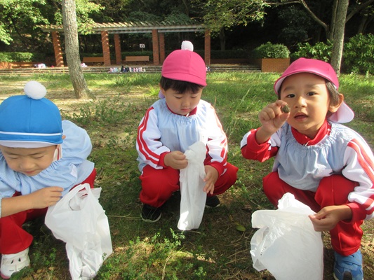 少しずつ暑さも穏やかになり、吹く風に秋の訪れを感じる頃となりました。10月29日(水)は年少組・4年保育組、30日(木)は年長組・年中組が園外保育で光貞池公園まで、小さな秋を見つけに行ってきました。途中、銀杏の木があり、落ちてい銀杏の臭いに「〇〇〇みたいな臭いがするね」と手で鼻を塞いでいました。ここにも秋がありました。坂道を降りていくと沢山の団栗に出会い、大喜びの子ども達。穴の開いた団栗には虫が住んでいて、お家になっている事を知った子ども達は、元の場所にそっと戻していました。数を数える子、大きさを比べる子と様々な姿が見られました。秋色に変身した落ち葉にも目を向け、虫食いの穴に「素敵な模様!」と話す子がいました。年々『 秋 』のシーズンが短くなってきていることがとても残念ですが、今後も自然の移ろいを感じられる機会を大切にしていきたいと考えています。