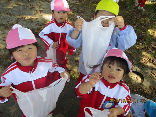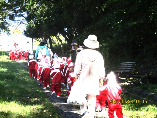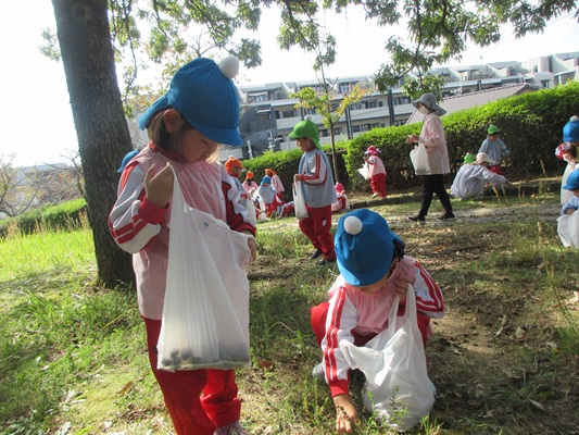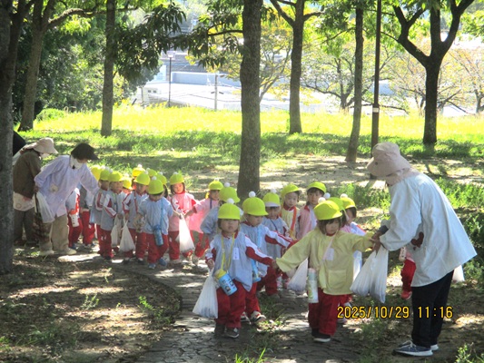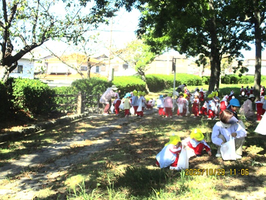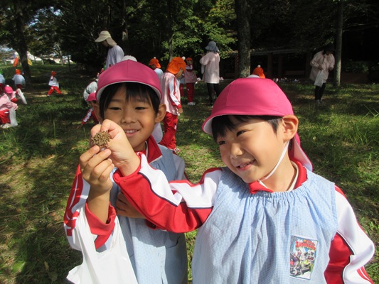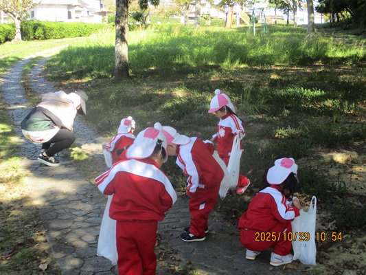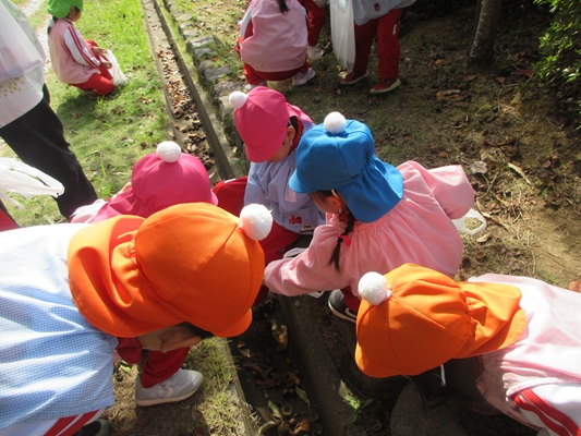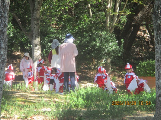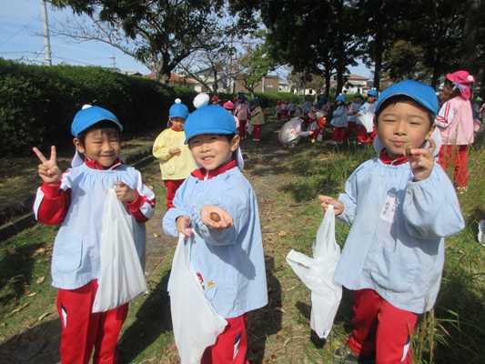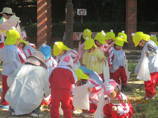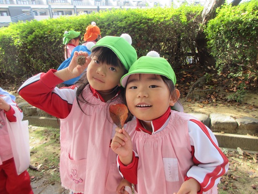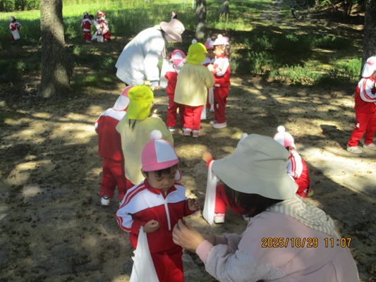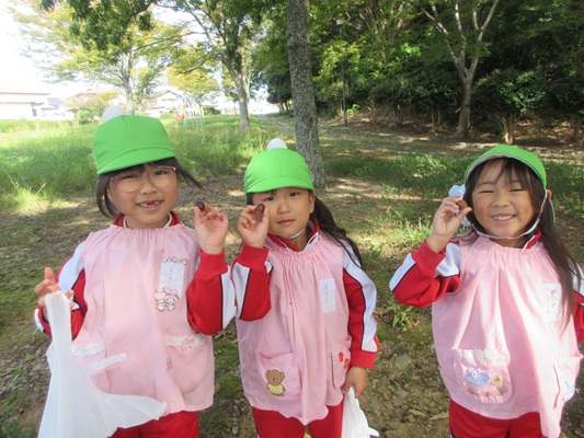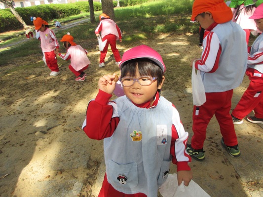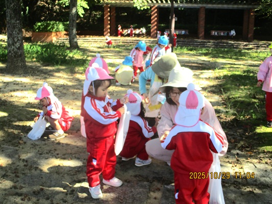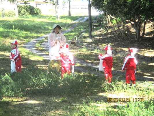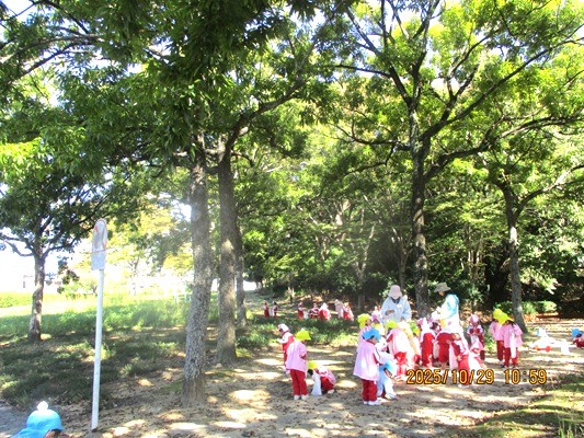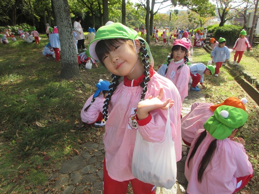 少しずつ暑さも穏やかになり、吹く風に秋の訪れを感じる頃となりました。10月29日(水)は年少組・4年保育組、30日(木)は年長組・年中組が園外保育で光貞池公園まで、小さな秋を見つけに行ってきました。途中、銀杏の木があり、落ちてい銀杏の臭いに「〇〇〇みたいな臭いがするね」と手で鼻を塞いでいました。ここにも秋がありました。坂道を降りていくと沢山の団栗に出会い、大喜びの子ども達。穴の開いた団栗には虫が住んでいて、お家になっている事を知った子ども達は、元の場所にそっと戻していました。数を数える子、大きさを比べる子と様々な姿が見られました。秋色に変身した落ち葉にも目を向け、虫食いの穴に「素敵な模様!」と話す子がいました。年々『 秋 』のシーズンが短くなってきていることがとても残念ですが、今後も自然の移ろいを感じられる機会を大切にしていきたいと考えています。