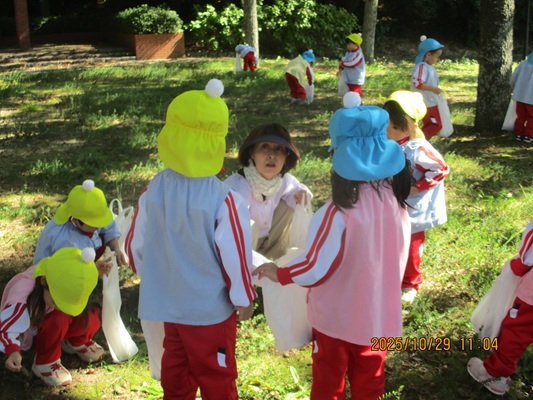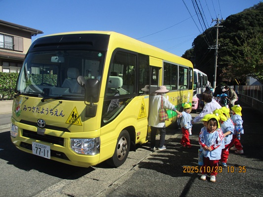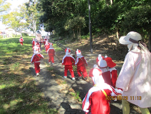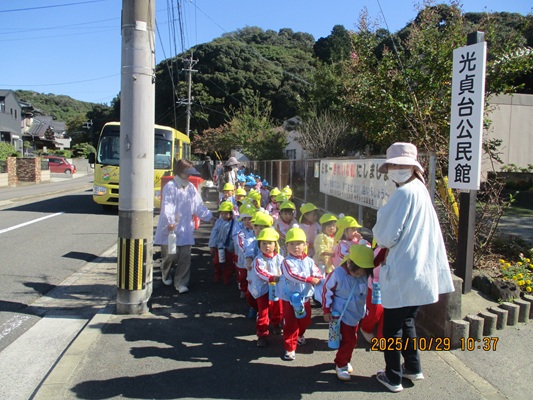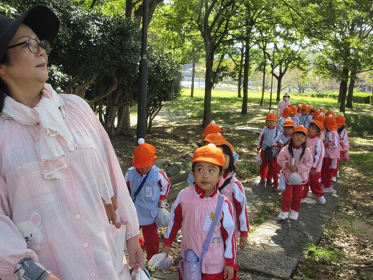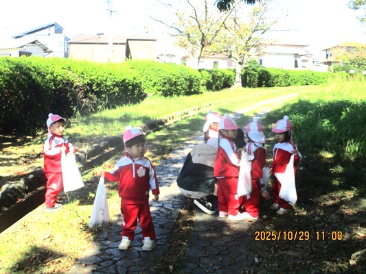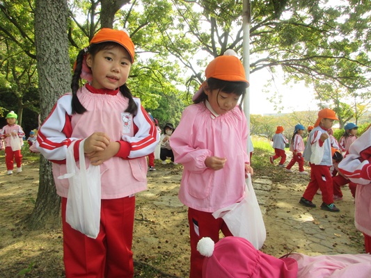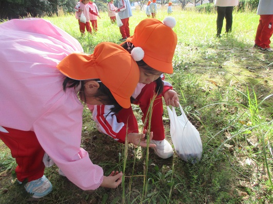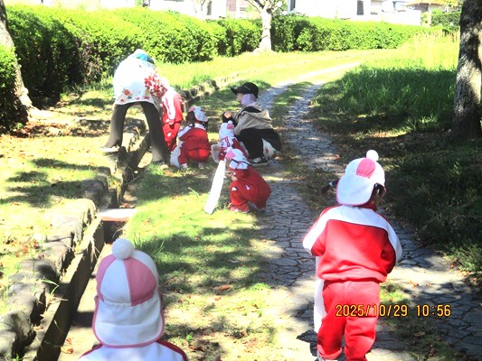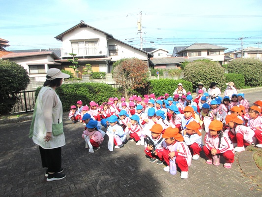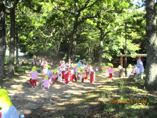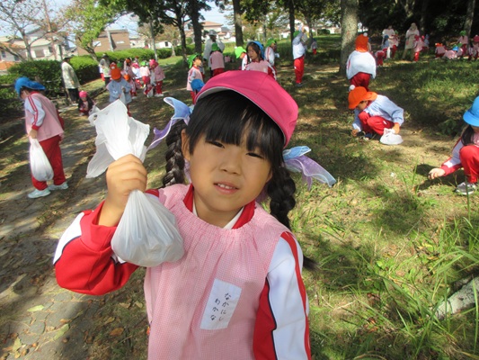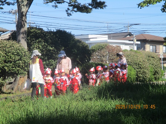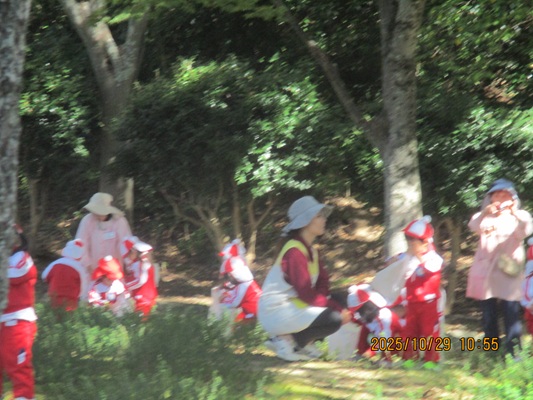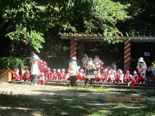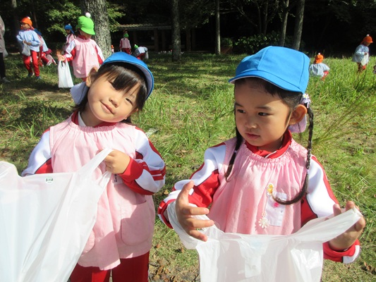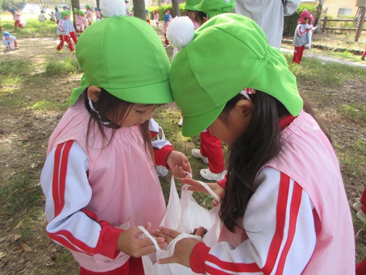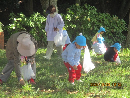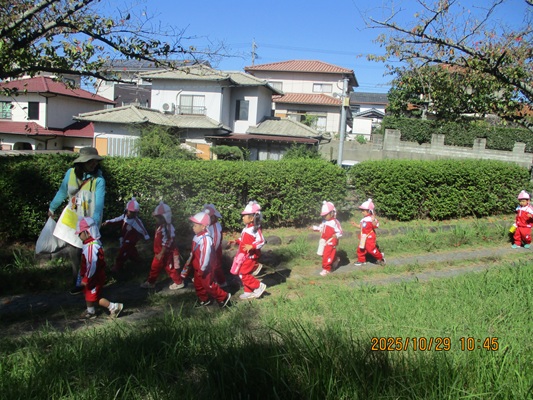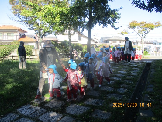 少しずつ暑さも穏やかになり、吹く風に秋の訪れを感じる頃となりました。10月29日(水)は年少組・4年保育組、30日(木)は年長組・年中組が園外保育で光貞池公園まで、小さな秋を見つけに行ってきました。途中、銀杏の木があり、落ちてい銀杏の臭いに「〇〇〇みたいな臭いがするね」と手で鼻を塞いでいました。ここにも秋がありました。坂道を降りていくと沢山の団栗に出会い、大喜びの子ども達。穴の開いた団栗には虫が住んでいて、お家になっている事を知った子ども達は、元の場所にそっと戻していました。数を数える子、大きさを比べる子と様々な姿が見られました。秋色に変身した落ち葉にも目を向け、虫食いの穴に「素敵な模様!」と話す子がいました。年々『 秋 』のシーズンが短くなってきていることがとても残念ですが、今後も自然の移ろいを感じられる機会を大切にしていきたいと考えています。