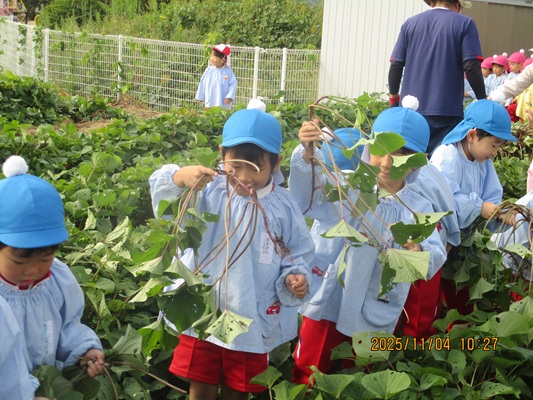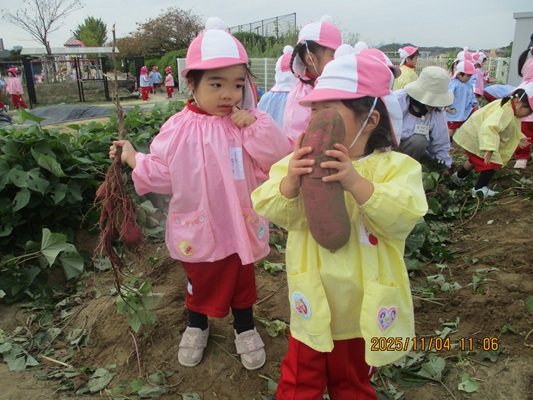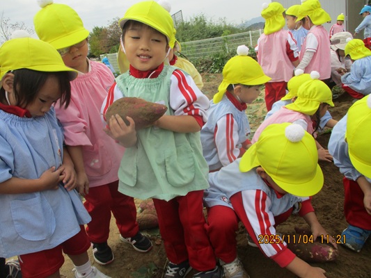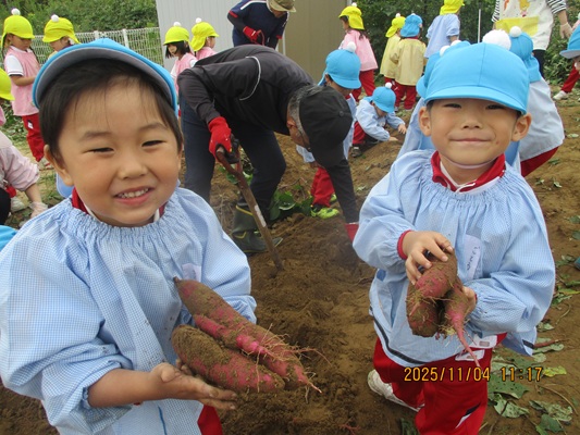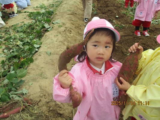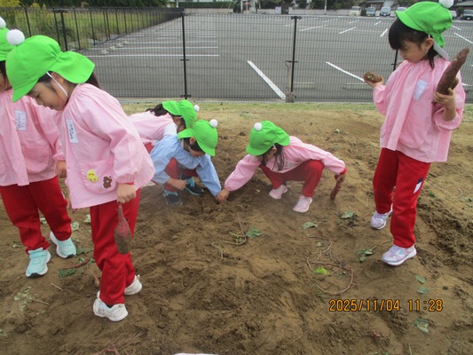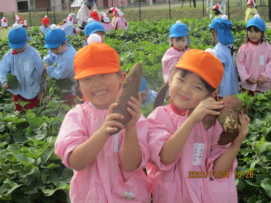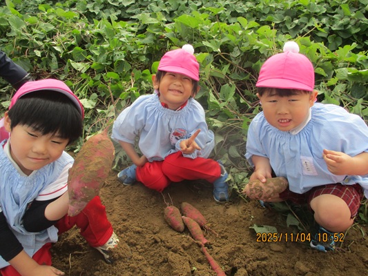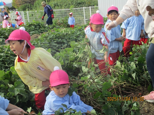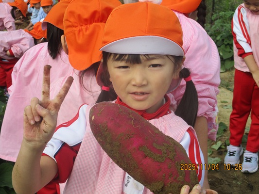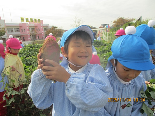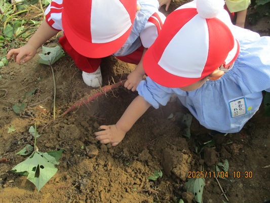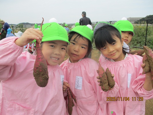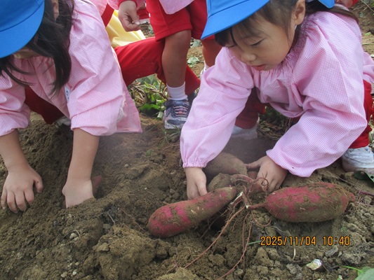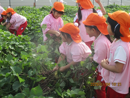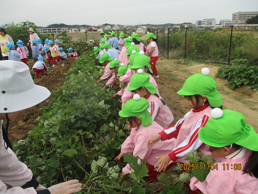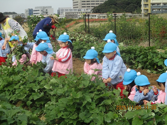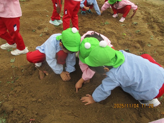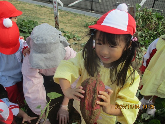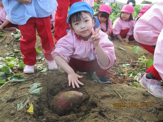 11月4日(火)は、幼稚園のなかよし農園で育てたさつま芋を収穫しました。友達と力を合わせて芋づるを引き抜き、思わず尻もちをつく子もいましたが、気持ちをすぐに立て直して、つるを引き続ける逞しい姿に成長を感じました。畑の土が肥えているので、虫も時々登場します。昨年まで「キャー」と叫んでいた子が、今年は平気だったことも成長だと思います。形や大きさが様々なお芋に大喜びの子ども達。土の感触を味わいながら、友達と力を合わせて取り組んだお芋堀りは楽しかったようです。『でっかいお芋』は、切り分けて焼き芋用となります。 そちらも今から楽しみの子ども達です。