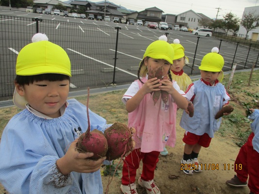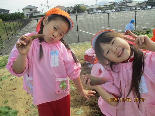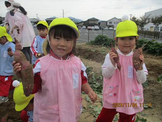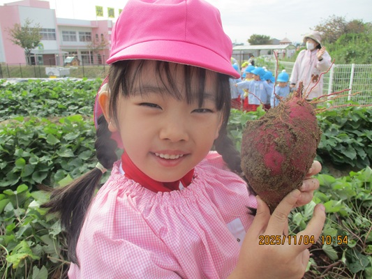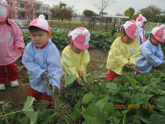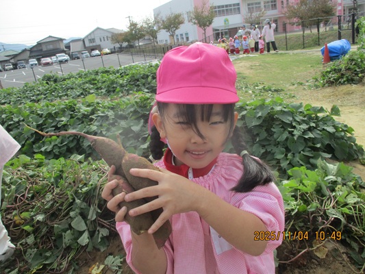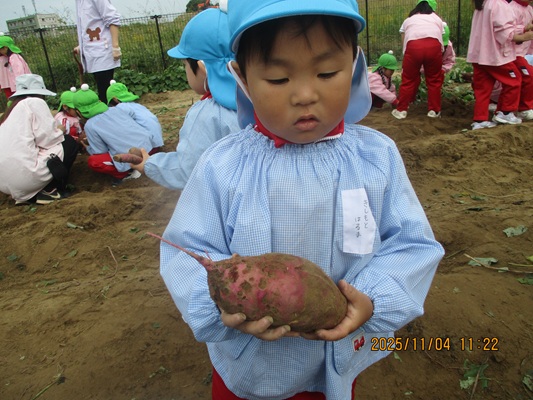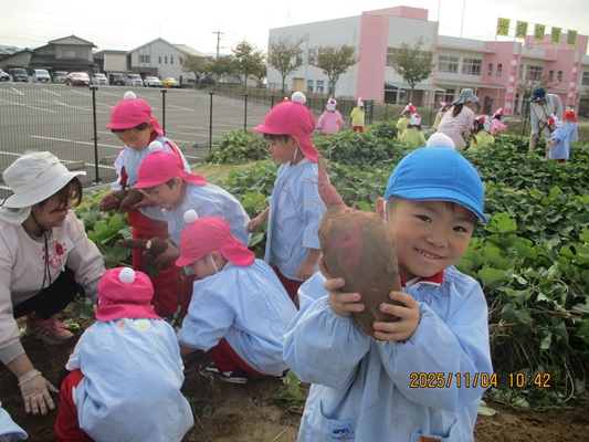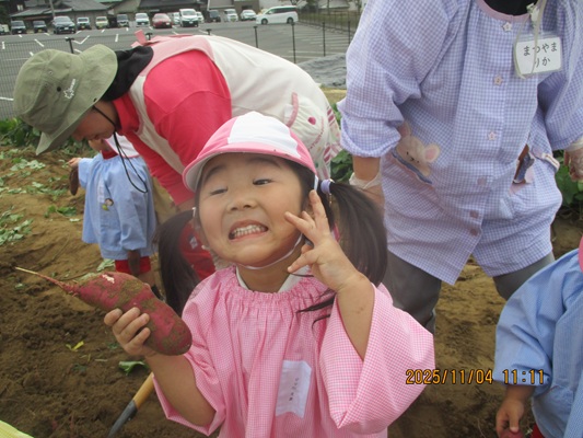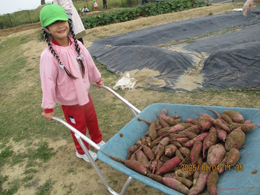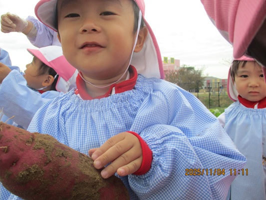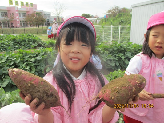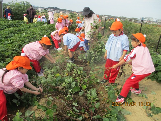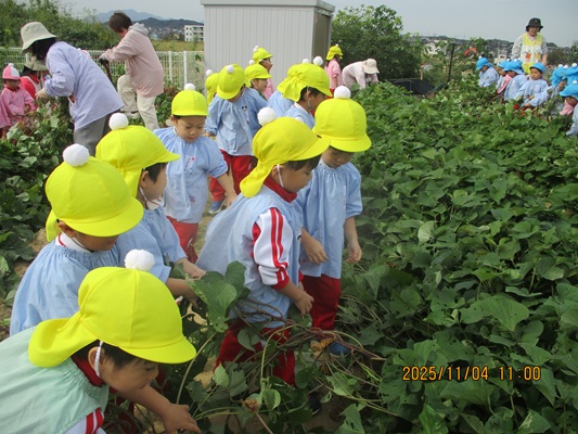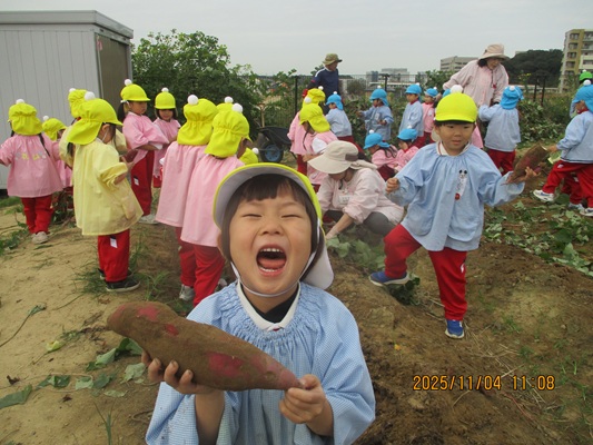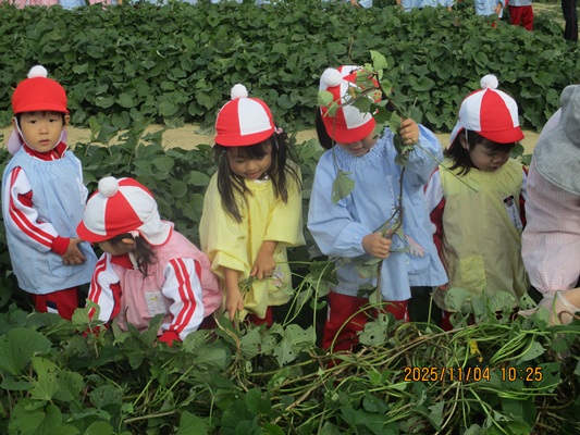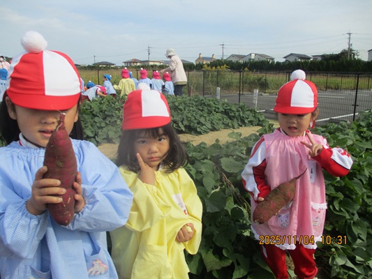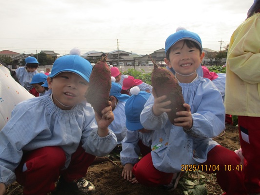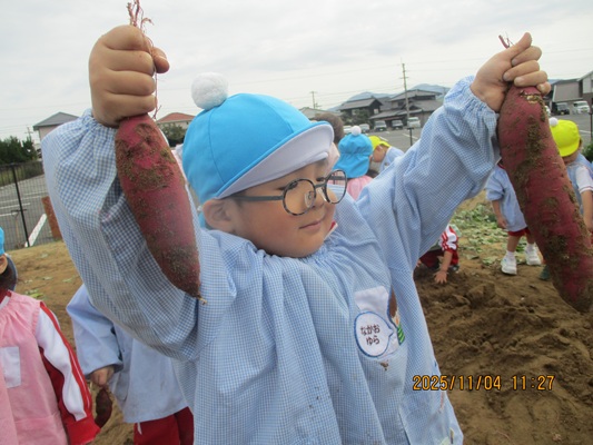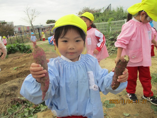 11月4日(火)は、幼稚園のなかよし農園で育てたさつま芋を収穫しました。友達と力を合わせて芋づるを引き抜き、思わず尻もちをつく子もいましたが、気持ちをすぐに立て直して、つるを引き続ける逞しい姿に成長を感じました。畑の土が肥えているので、虫も時々登場します。昨年まで「キャー」と叫んでいた子が、今年は平気だったことも成長だと思います。形や大きさが様々なお芋に大喜びの子ども達。土の感触を味わいながら、友達と力を合わせて取り組んだお芋堀りは楽しかったようです。『でっかいお芋』は、切り分けて焼き芋用となります。 そちらも今から楽しみの子ども達です。