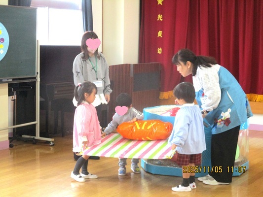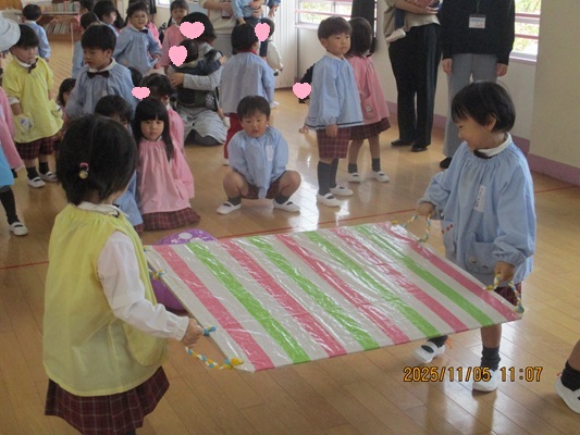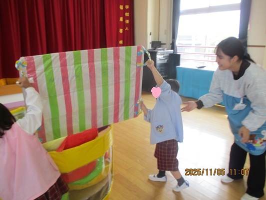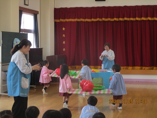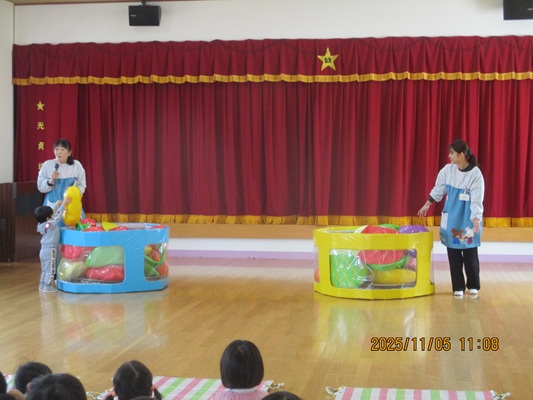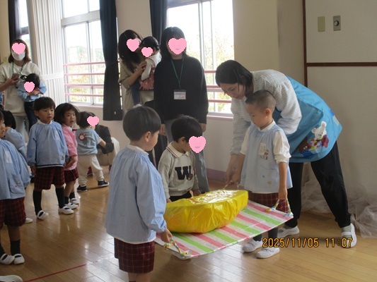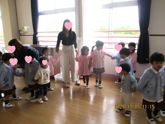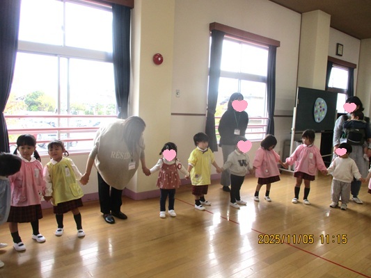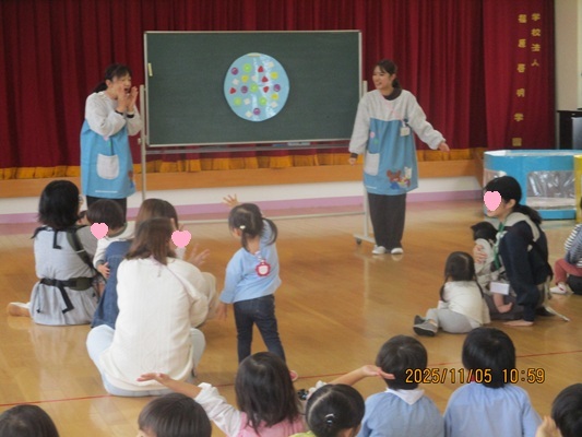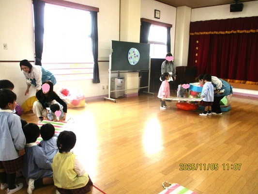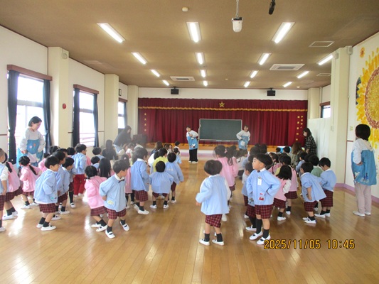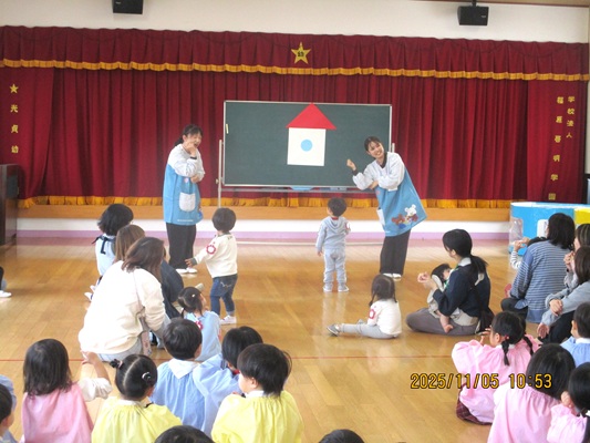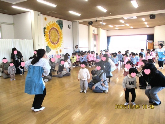 11月5日(水)は、未就園児(満2歳児・満3歳児)の親子触れ合い活動『おはようクラブ』を実施しました。今回は年少児との交流会で出し物を見た後は、ゲームやダンスで触れ合い遊びを楽しみました。