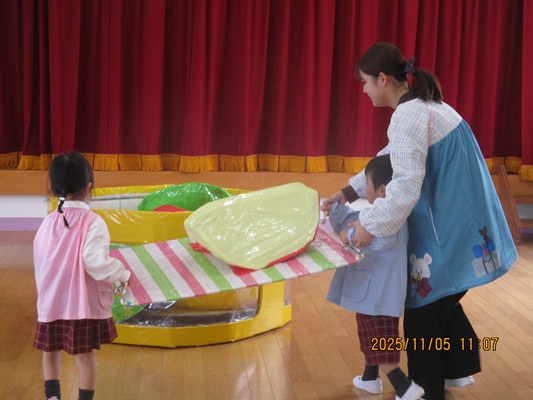 年少組が運動会で行った親子競技の果物運び『フルーツポンチづくり』を、今回は未就園児親子さんと力を合わせて頑張りました。他にも手を繋いだり踊ったりしながら楽しい時間を過ごすことが出来ました。