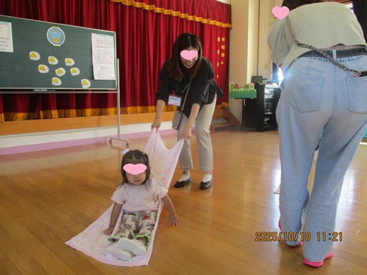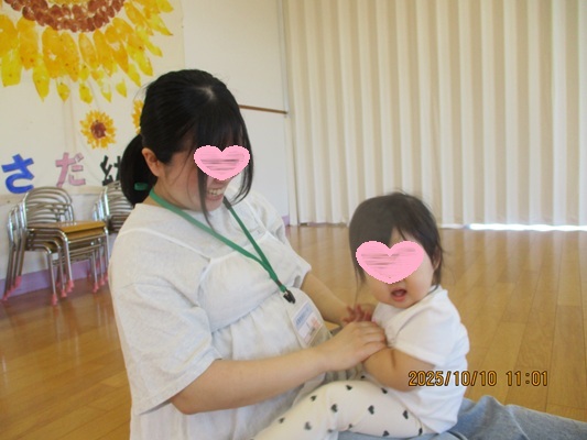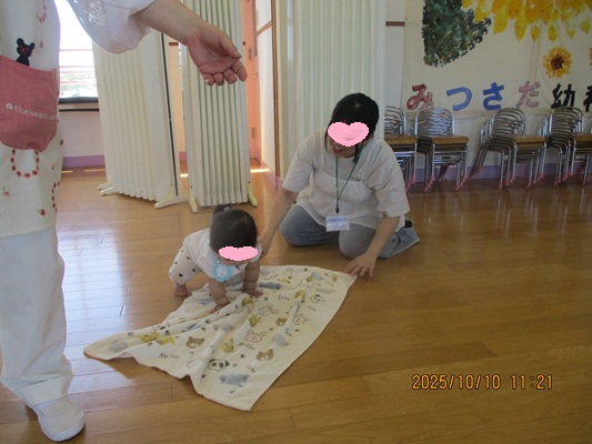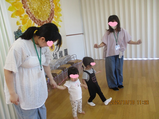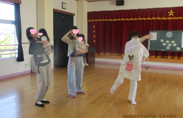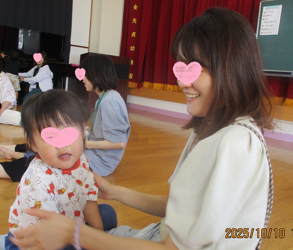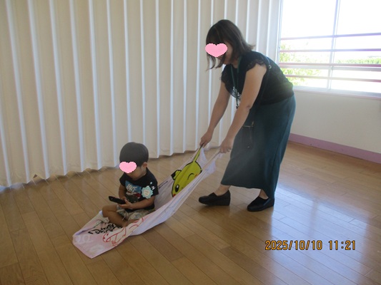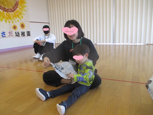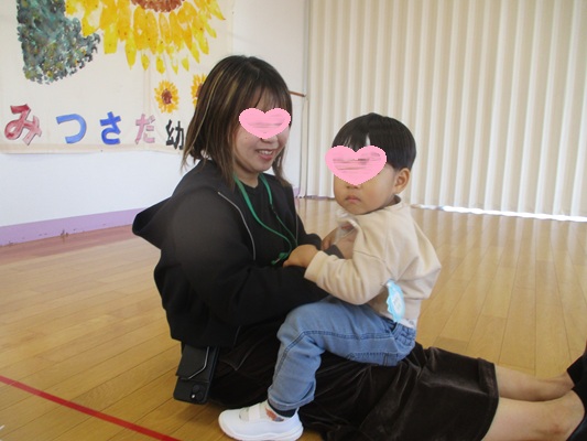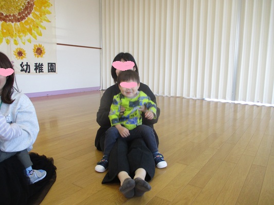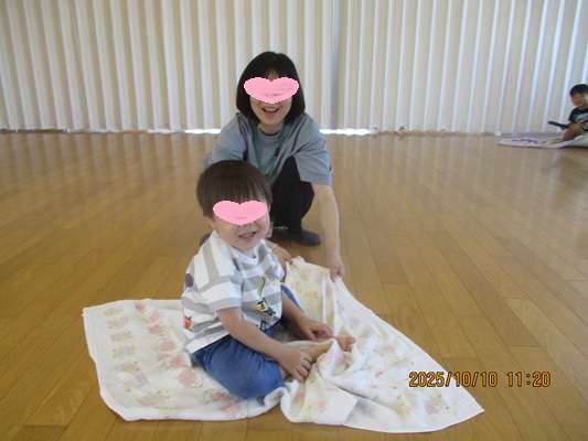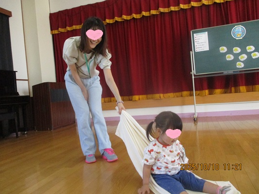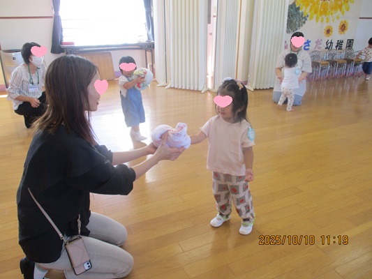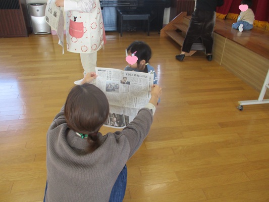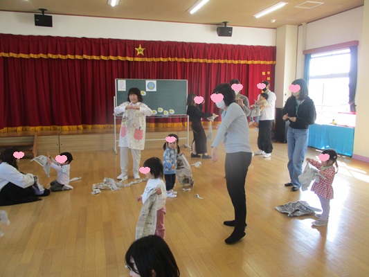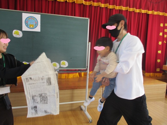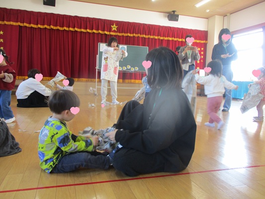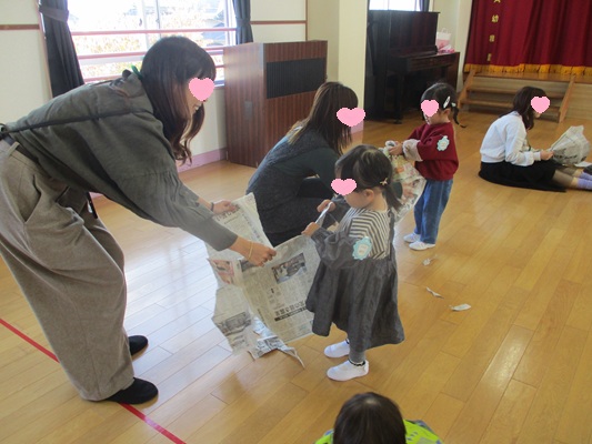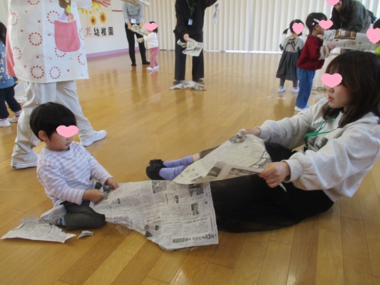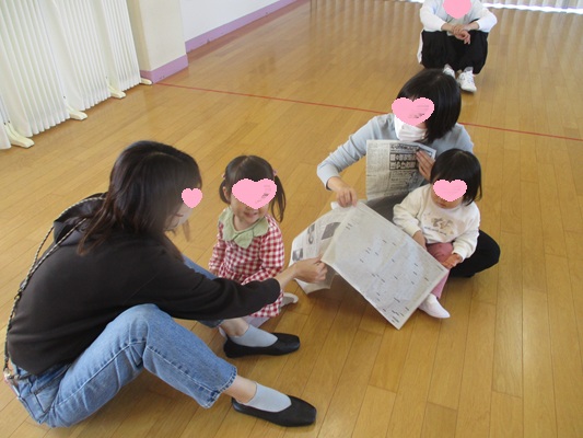 幼稚園にご入園される前のお子様と保護者の方とが一緒に楽しめる『ふわふわクラブ』では、愛着を育てるほのぼのとした活動を月毎に用意しています。10月は、バスタオルを使った遊び(結んで転がす、両手で投げ上げる、魔法の絨毯)、11月は、新聞紙を使った遊び(いないいないばあ、引っ張り合い、破って新聞紙シャワー、丸めてヨーヨー作り)を親子で楽しみました。子ども達のみでなく、保護者の方も顔見知りとなり、