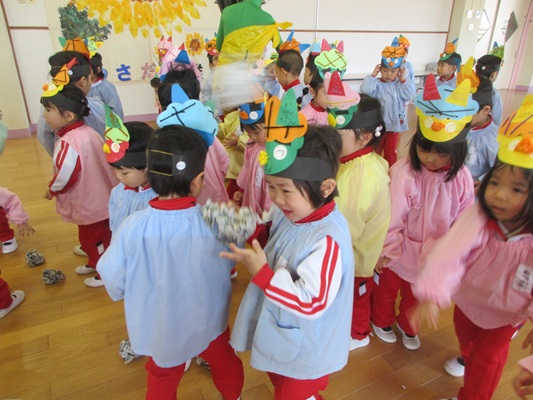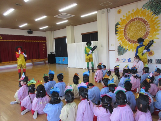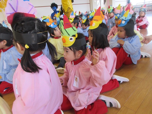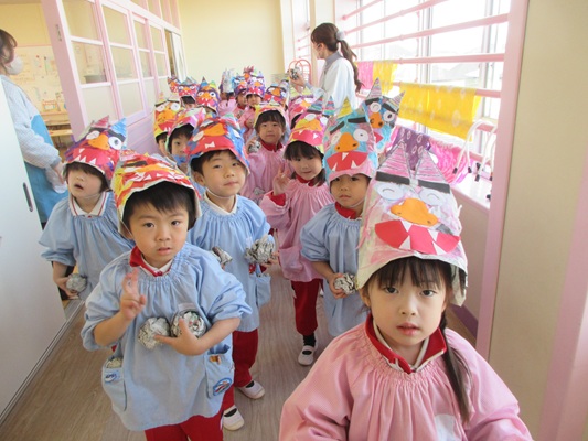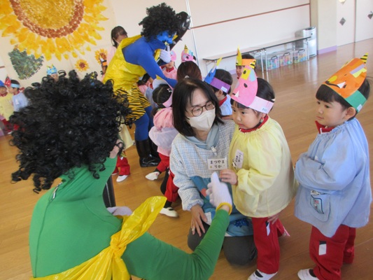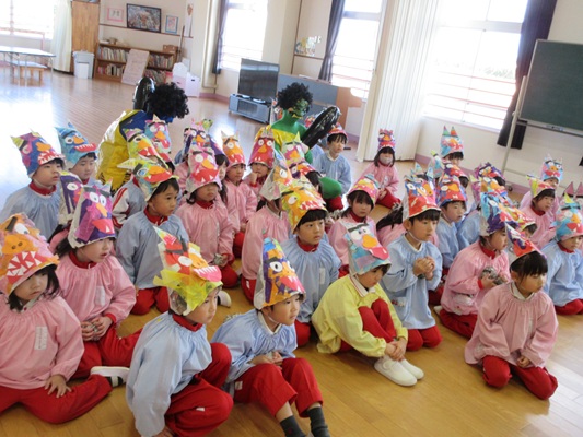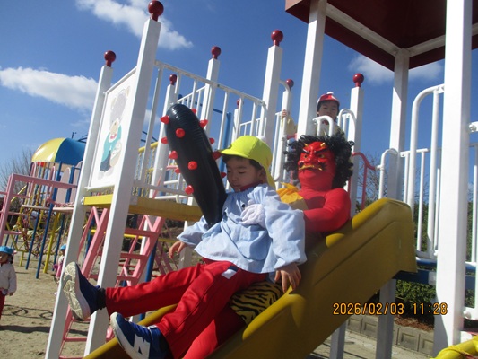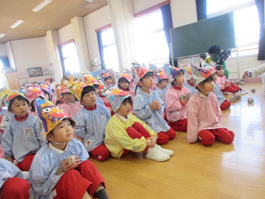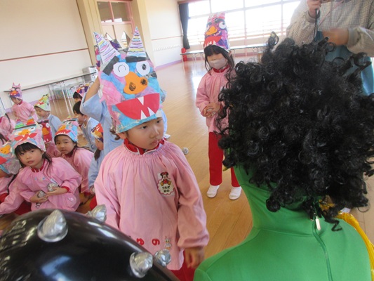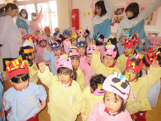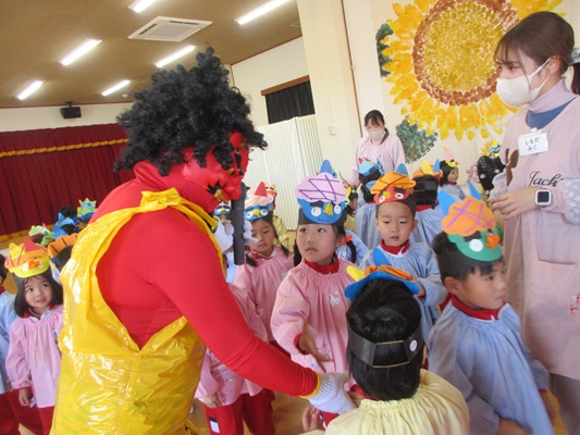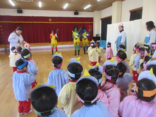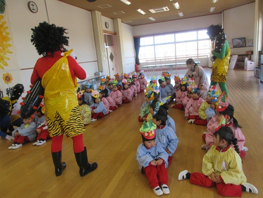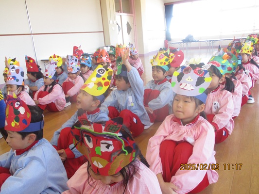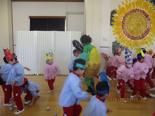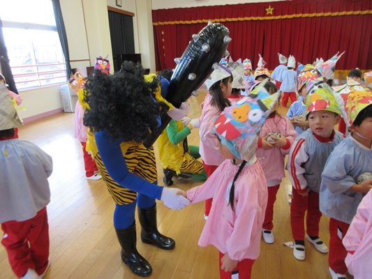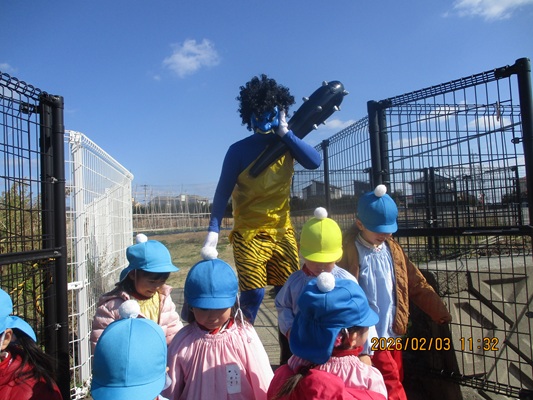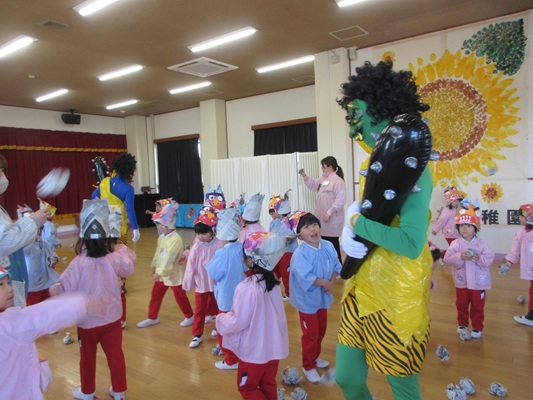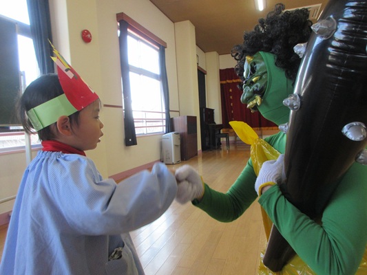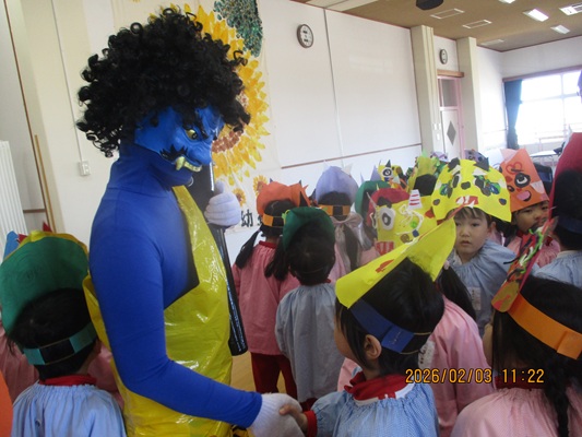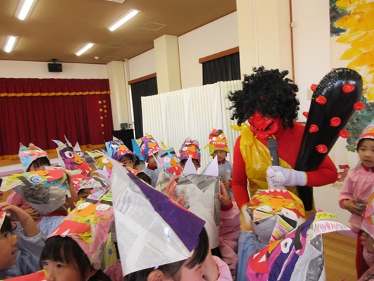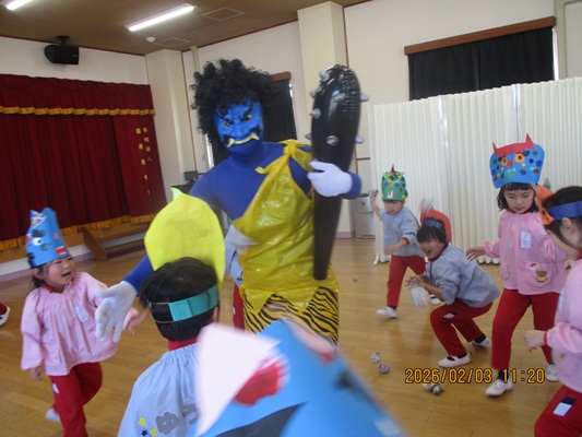 2月3日(火)は、光貞幼稚園に鬼さんがやってきました。子ども達は、鬼さん目掛けて「鬼は外~福は内~」とお豆(新聞紙)を必死に投げていました。鬼さんから「身体の中に、我がまま鬼、好き嫌い鬼、泣き虫鬼、意地悪鬼・・・がいる子は手を上げて」の声掛けに、真剣な眼差しで手を上げる子がいました。小さいながらも、自分の事を客観的に見る機会となりました。最後には、良い子になることをお約束してお別れしました。今夜は町のあちらこちらでも「鬼は外! 福は内!」の声が聞こえてくることでしょう。